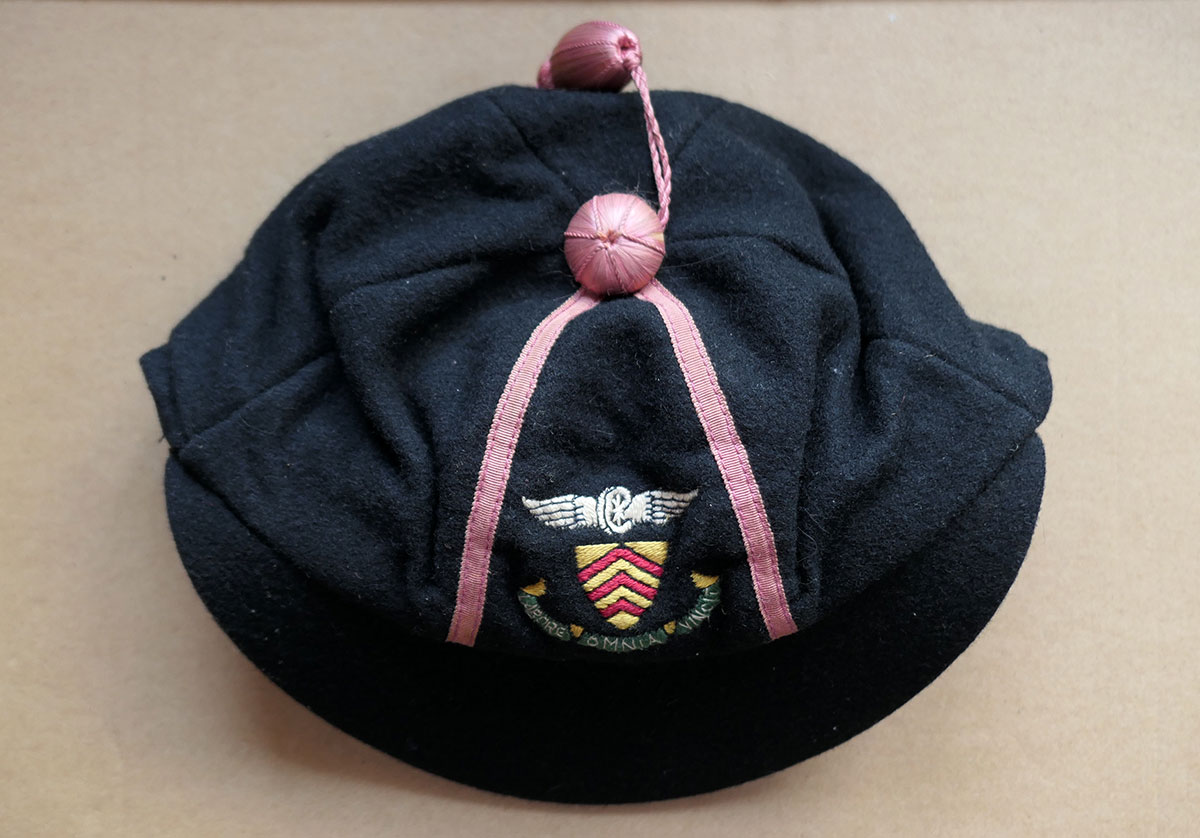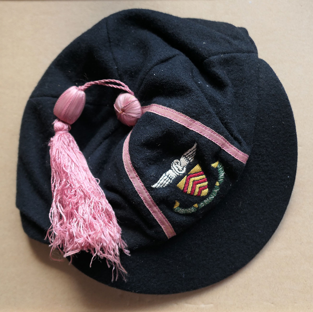 Schoolboy’s felt cap from the early 20th century, in excellent condition for its age and presumed usage as a seat liner for a muddy hideout or conker storage by a Just William type character. The pink silk tassels are perfectly preserved, around an embroidered motto reading ‘Labore Omnia Vincit’ (work conquers all, a motto that Just William would certainly not have agreed with). The size is approximately 7 1/4, on the large size for a child’s hat and therefore would easily fit an adult, perhaps in training for a future Chap Olympiad.