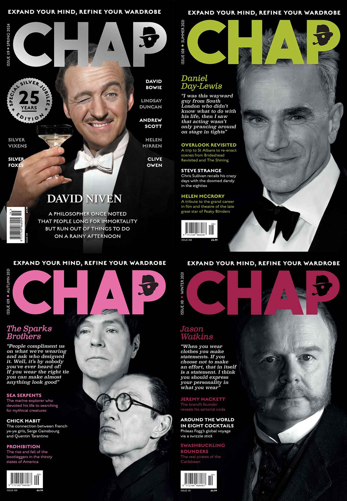 Three editions from 2021 plus the Silver Jubilee edition from 2024. Interviews include Daniel Day-Lewis, Jason Watkins, Ron and Russell Mael, and David Devant & His Spirit Wife, with features on Salvador Dali, the Marx Brothers, Jules Verne, Talking Pictures TV, Anna May Wong and Patricia Highsmith, Jeremy Hackett, Sea Serpents, Loungewear, Village Cricket, Ski Wear, Pirates, Steve Strange, Helen McCrory, the Overlook Hotel, Grenson Shoes, Salvador Dali and much, much more.