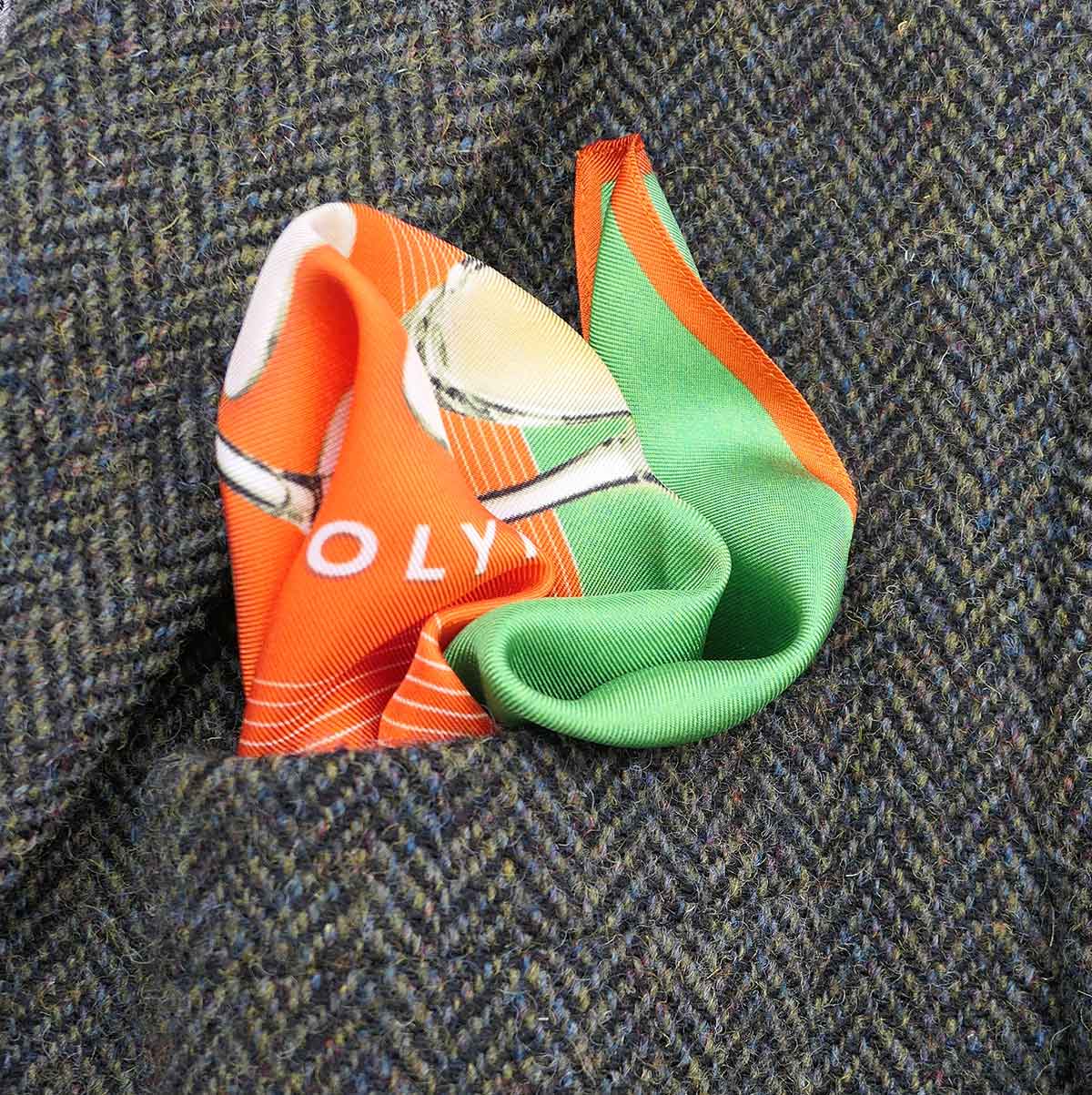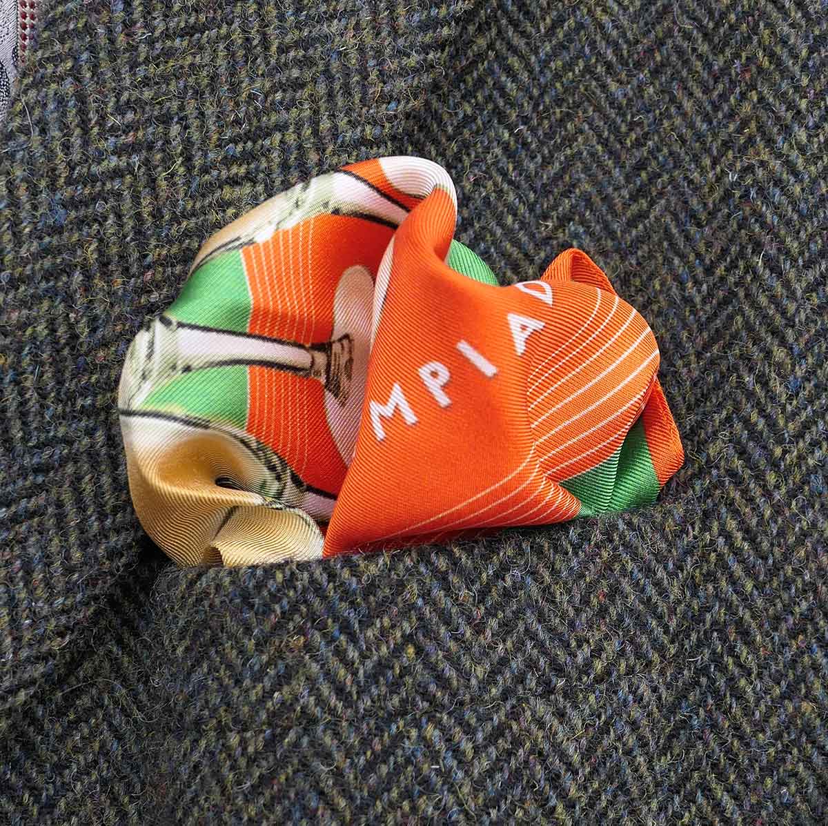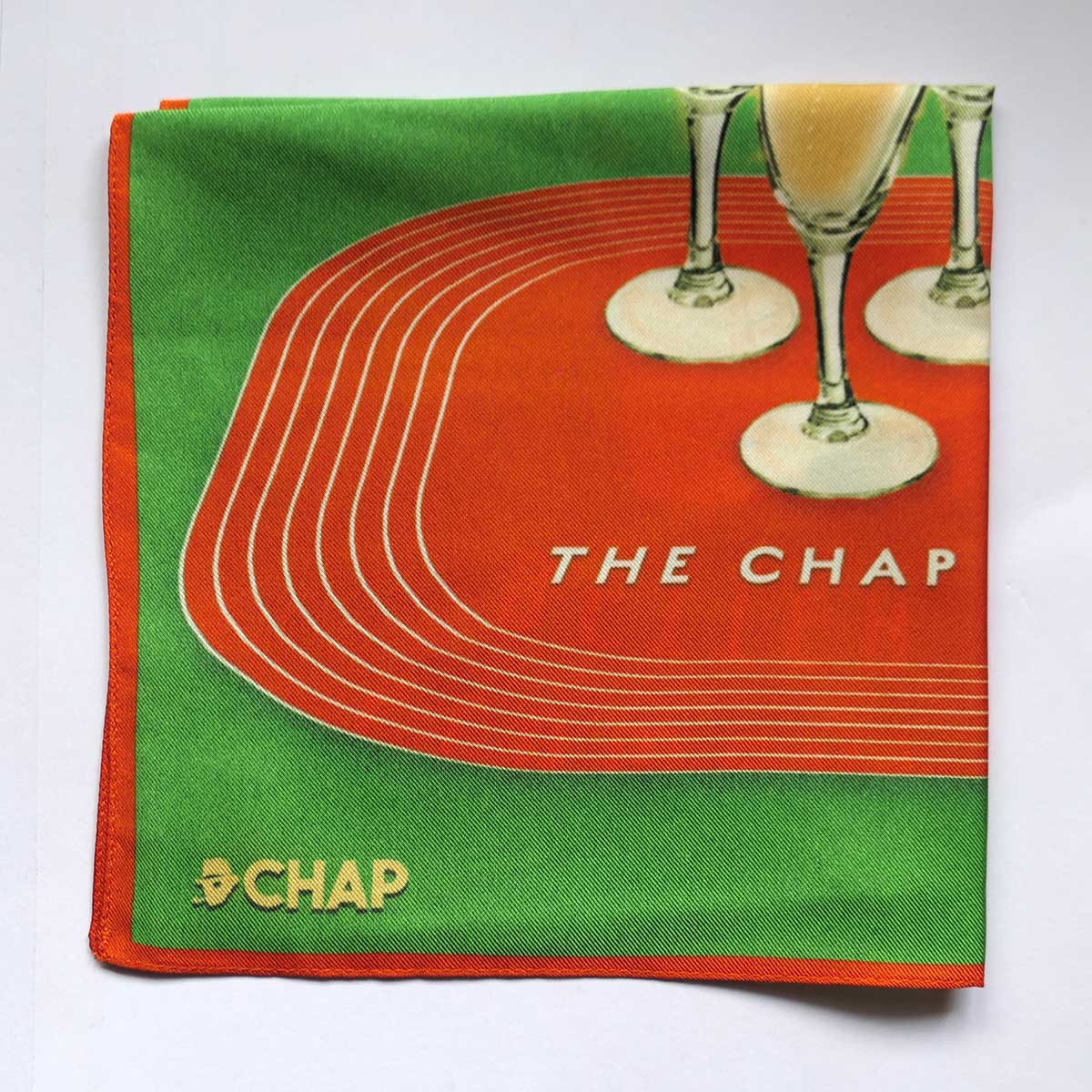 To mark the publication of our history of The Chap Olympiad, Slower, Drunker, Better Dressed, Geoff Stocker has designed this commemorative pocket square, whose brimming champagne flutes deftly mimic the Olympic rings on an athletic track that would, ironically, have proved too exhausting for the Chap Olympians, who had enough trouble wafting along a ten-metre track made of Astroturf. The design folds cleverly into the breast pocket in a multitude of pleasing ways, allowing the wearer to arrange a completely different display every time. The Chap Olympiad Pocket Square measures 30x30cm and is printed on 100% silk.