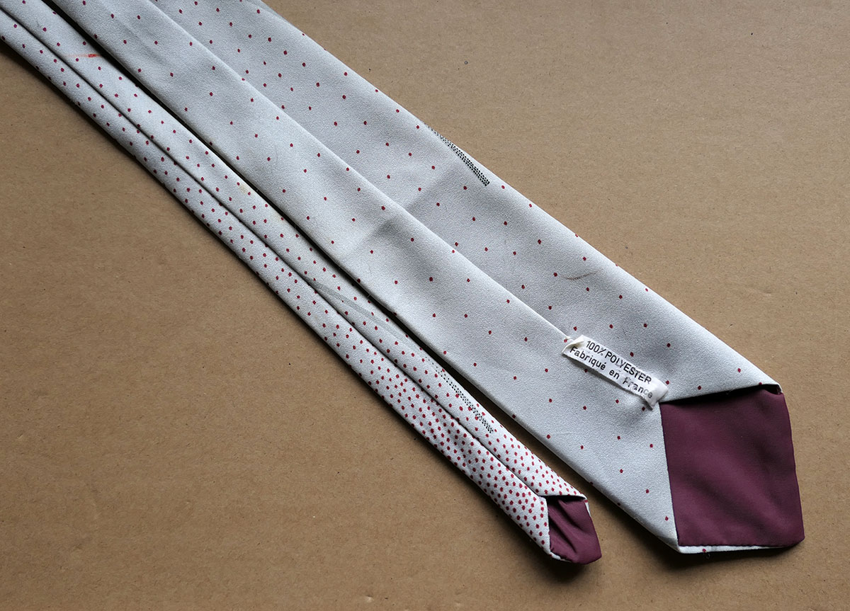 Polyester swing tie from France, circa 1960s, with red dots on a pearl-grey background and black and grey swirling lines on the front. Ideally worn with a zoot suit or a mohair number, the tie measures 136cmx8cm.
