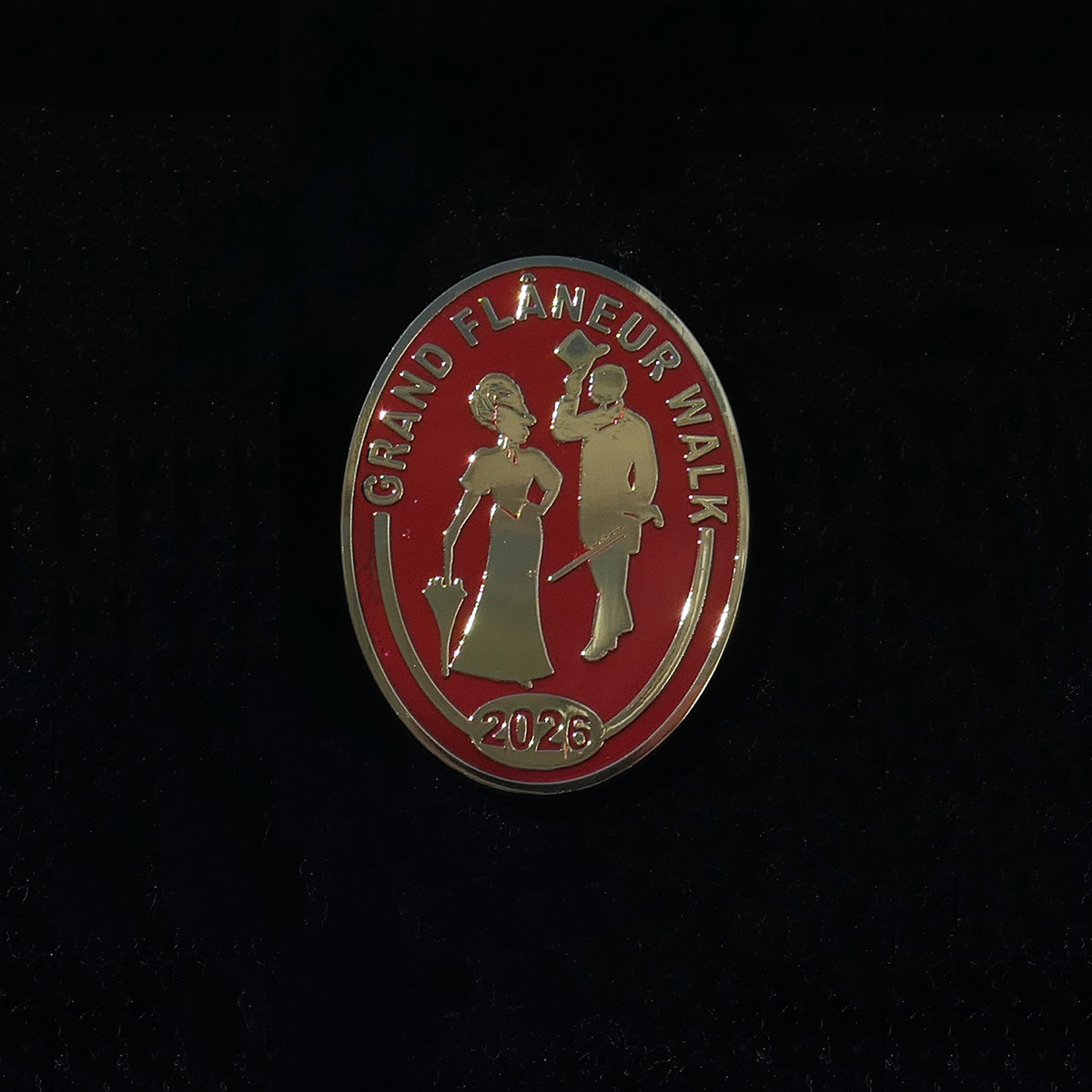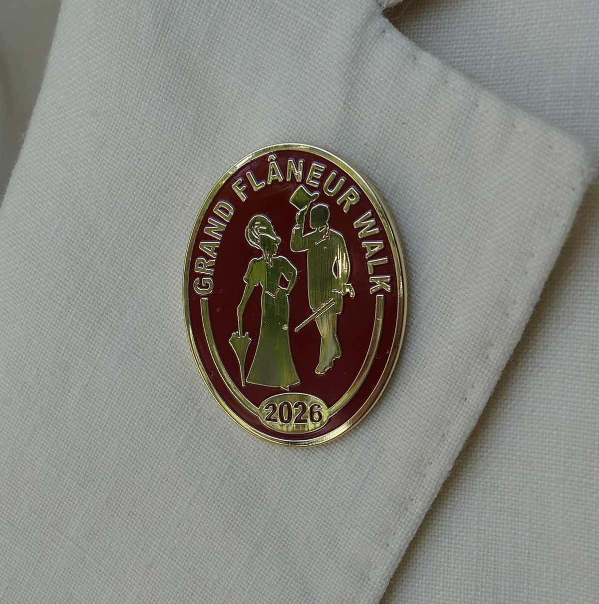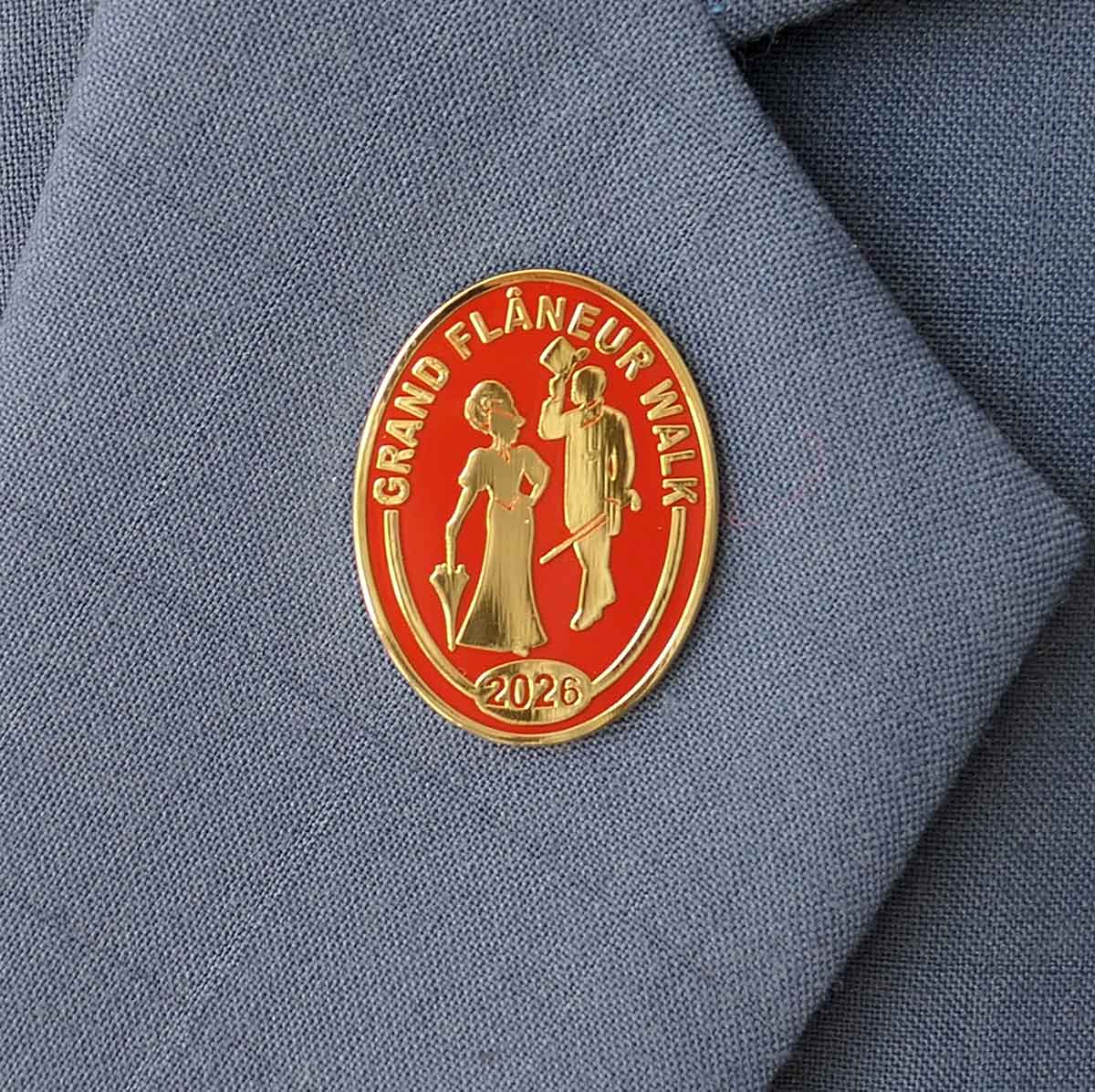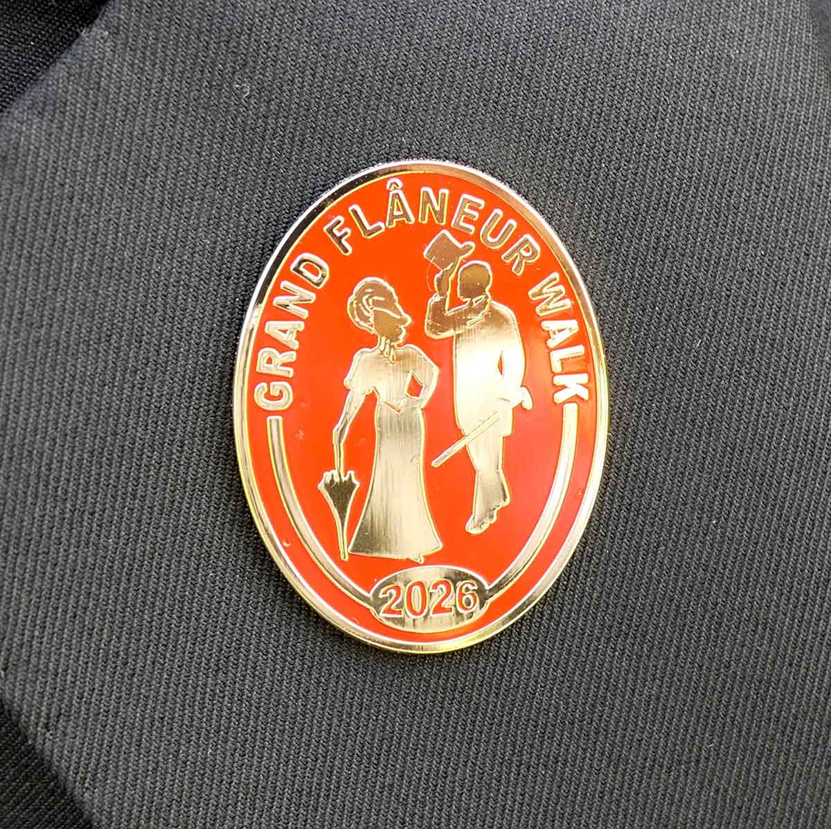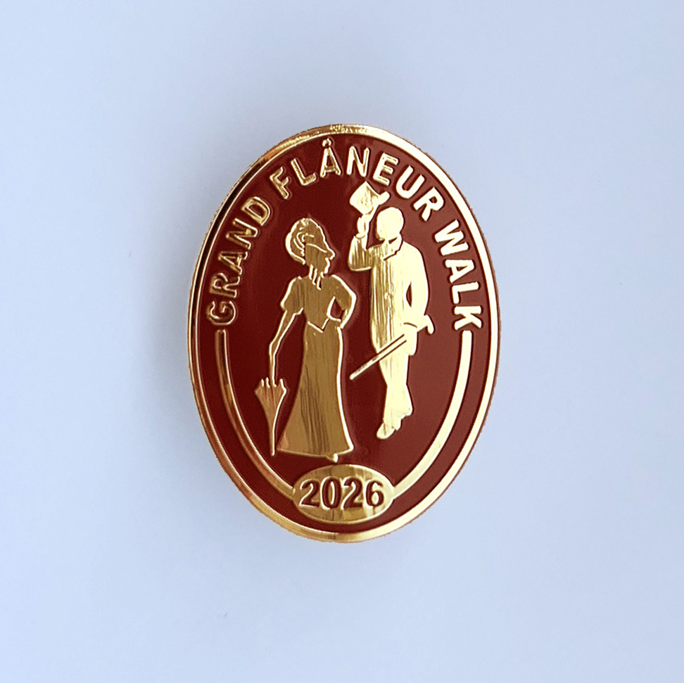 Those who set off on the Grand Flâneur Walk in 2026 will want a beautiful item that both commemorates the walk and also reminds them of the fact that, simply by taking the first step on that walk, they set themselves apart from other folk who are merely walking somewhere. By aligning themselves with the great flâneurs of the past such as Baudelaire, Wilde and Poe, they declare themselves to dwell among the demi-monde where only a flâneur feels at home. The badge measures 37x27mm and is made from russet enamel on 24-carat gold, fastened with a butterfly clip to the rear. “I let myself be lured into long spells of senseless and sensual ease,” wrote Oscar Wilde, “I amused myself with being a flaneur, a dandy, a man of fashion.”