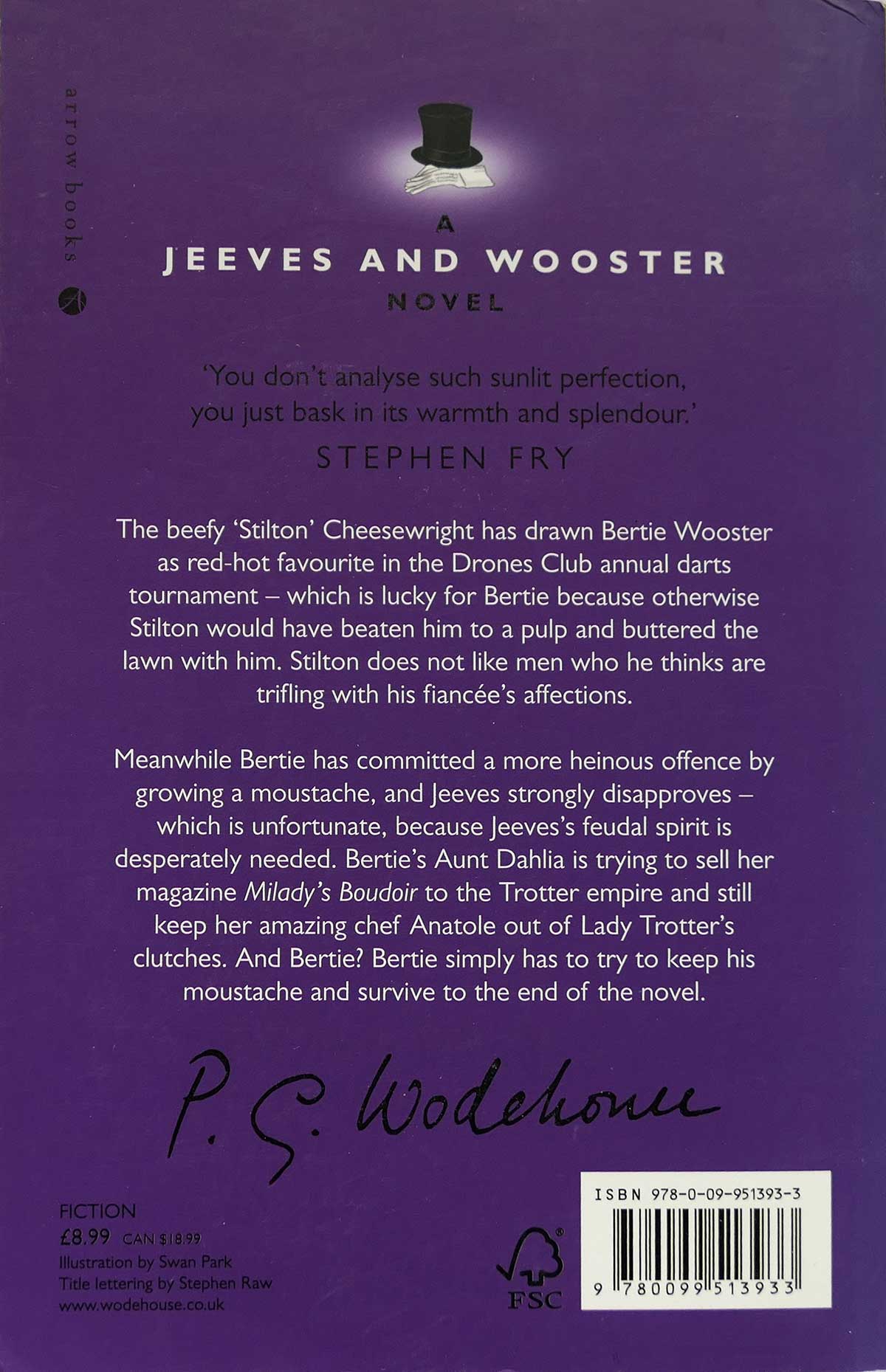 “As I sat in the bath-tub, soaping a meditative foot and singing, if I remember correctly, ‘Pale Hands I Loved Beside the Shalimar’, it would be deceiving my public to say that I was feeling boomps-a-daisy.” Any reader not compelled to read on until the very end must have a heart of stone. In this Jeeves and Wooster outing, Bertie offends his valet by growing a moustache, and is forced to compete in a darts tournament at the Drones against ‘Stilton’ Cheesewright, while Aunt Dahlia attempts to get her lady’s magazine Milady’s Boudoir into the Trotter empire, while keeping their hands off her precious French chef Anatole. This is the paperback edition in immaculate condition.