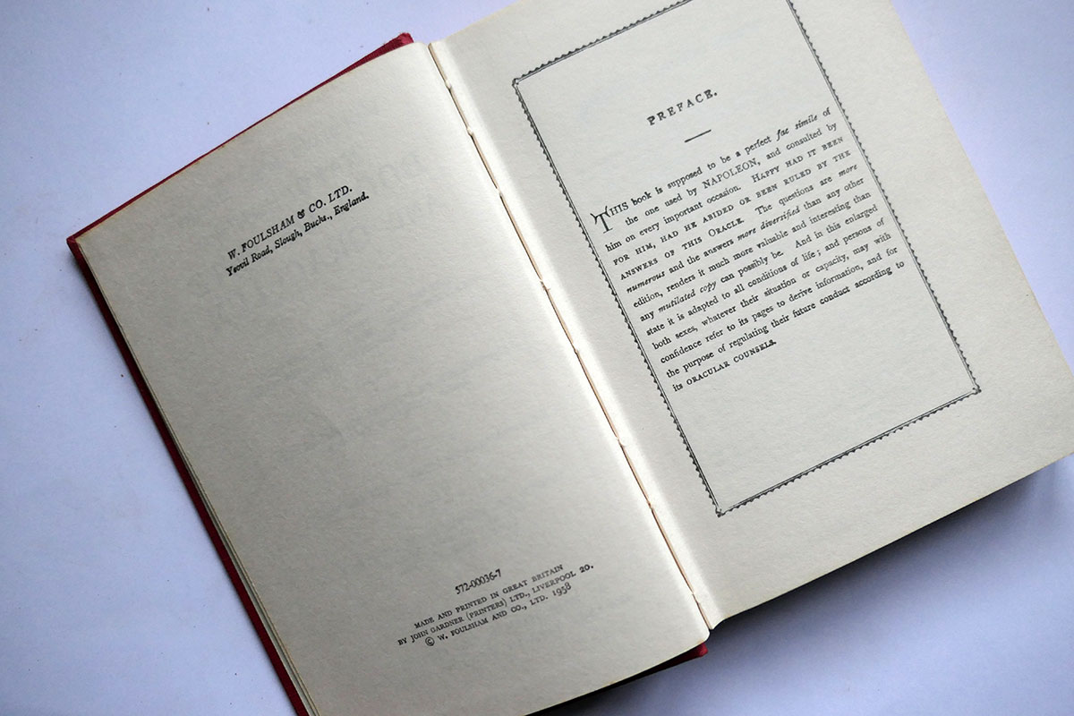 Napoleon’s Book of Fate and Oraculum has been attributed to the famous French emperor. The book is a collection of oracles and divinations said to have been used by Napoleon himself to make important decisions and predict the future. The book is in three parts, the first a series of questions and answers to be used as a fortune-telling game. The second part is a collection of oracles to be consulted for specific situations or decisions. The third part is a set of astrological tables used to calculate the positions of the planets and stars. Some believe that the book was actually written by a group of occultists who were associated with Napoleon, rather than by the emperor himself. This is the first edition of the 1958 English translation in very good condition.