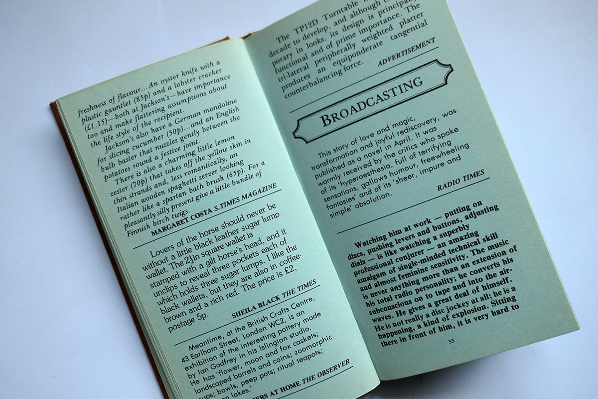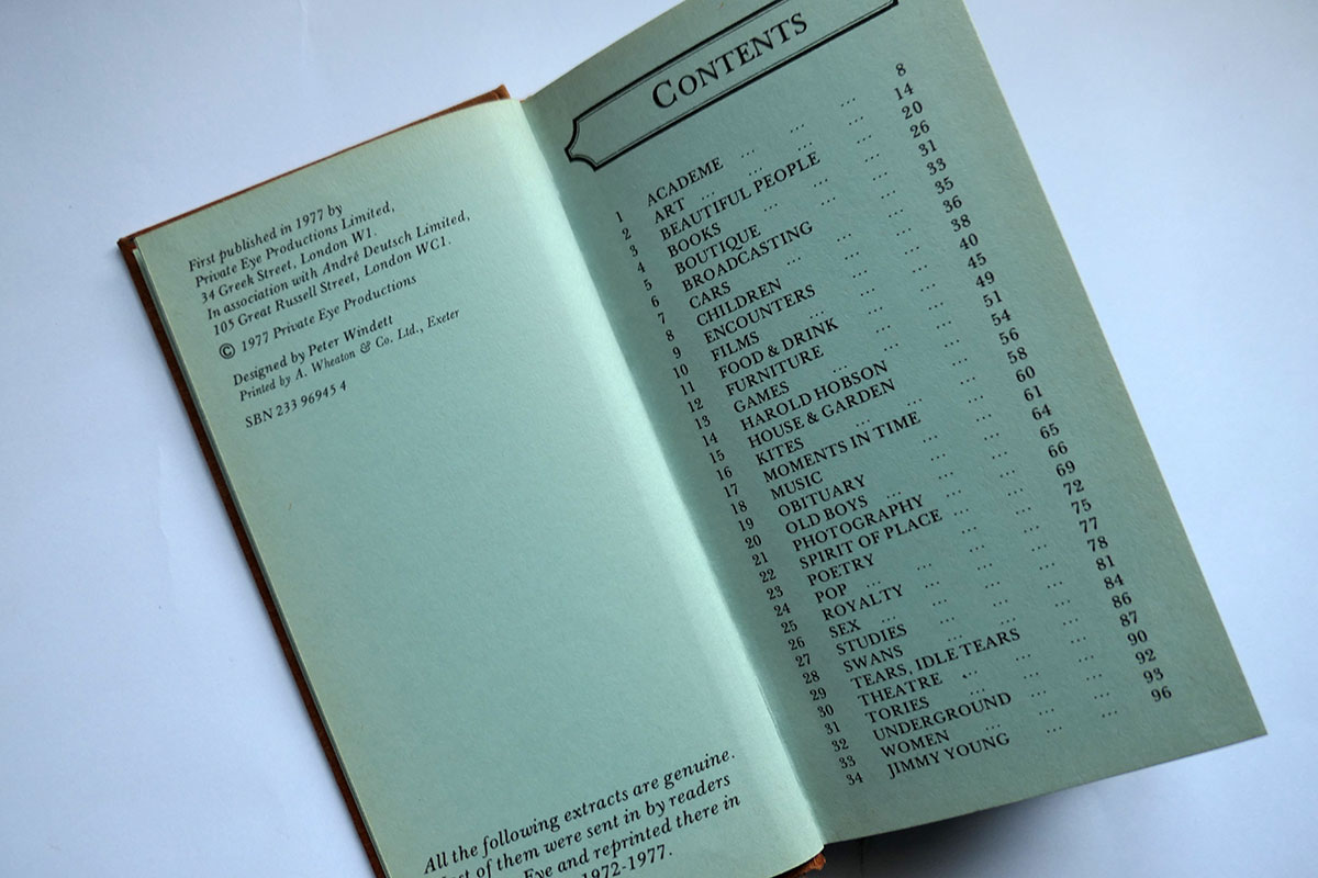 Even if you don’t buy into the entire contents of Private Eye, Pseud’s Corner is always a treat – republished excerpts from other publications that show extreme pretentiousness (some might say that the entire contents of The Chap could have appeared there over the years, but luckily they didn’t spot that). This is the 1977 collection of Pseud’s Corner entries from 1972-1977, including such gems as, “In a way, I suppose my suits are like works of art, I certainly approach them that way. Like pieces of sculpture, each one unique, expressing something different, and expressing something of myself.” This hardback first edition is in very good condition.