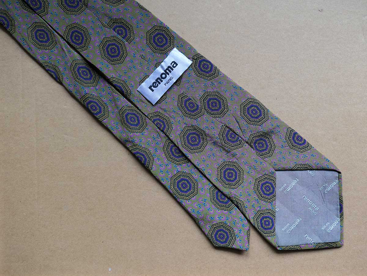 Founded in Paris in 1961 by French designer Maurice Renoma, the brand was always at the cutting edge, finding favour with the Gang du Drugstore, an emblematic group of Parisian hep cats who enjoyed hanging about Renoma’s flagship store on the Champs ElysĂ©es. This tie measuring 146x9cm, is a typically understated Renoma design, with fucia and dark blue hexagons emerging from a bed of pink flowers on a khaki background.