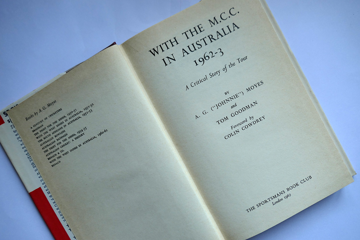 With a ringing endorsement by MCC Vice-Captain Colin Chowdrey, who in his introduction expresses his sadness at the passing of the book’s author A.G. Moyes, and commends the stepping in of Tom Goodman to finish it, one knows that, by reading this book, one is in the capable hands of those who were at the forefront of the noble game of cricket during the early sixties. The 1962-63 tour is described in great detail, including all scores and match data, and black and white photographs of the action. This is the 1965 Sportsmans Book Club edition in very good condition.