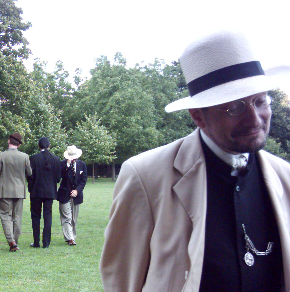 Little is known about The Curé’s early life, nor indeed the year of his birth. He simply wafted into the very first Chap Olympiad, brought by his university friend Fiona Salter, in July 2004 and seemed to fit in immediately. His garb was devotedly Edwardian, the studied clothing of an off-duty curate, each item lovingly sourced for its period accuracy. Much of it was black, although on his first appearance within our ranks he had donned a cream linen jacket and white Panama hat over what would prove to be his customary black trousers and waistcoat – always with an impressive pocket watch, chain and fob.